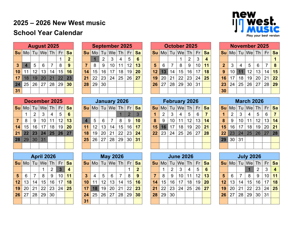 Greyed-out dates indicate studio closures (No lessons take place).